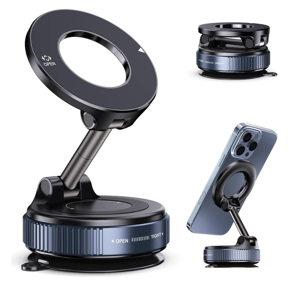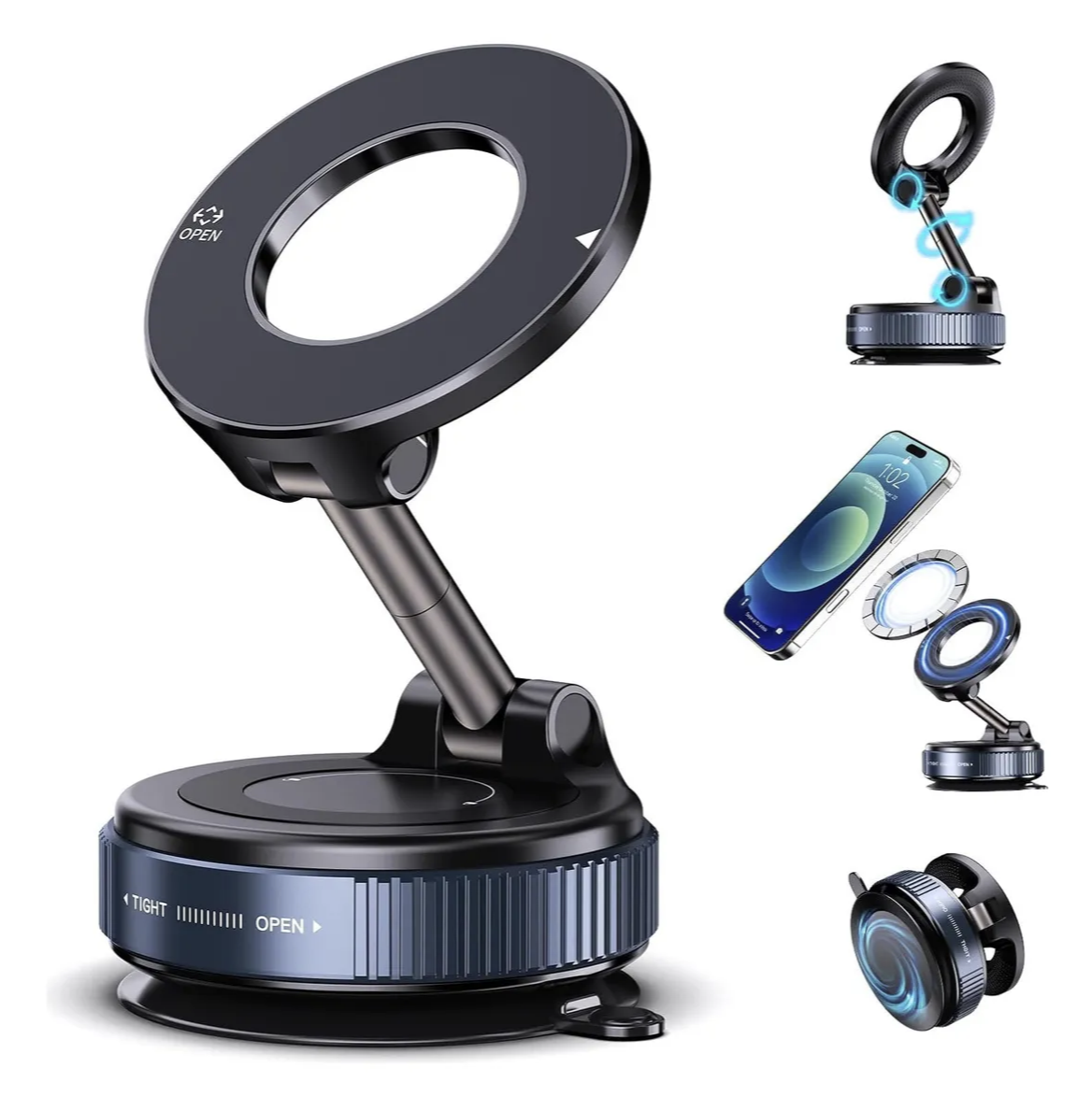 Con un diseño de succión al vacío, este soporte para teléfono proporciona adhesión a doble cara, lo que le permite fijarse de forma segura a varias superficies.Ya sea que lo coloques en tu tablero o parabrisas, puedes confiar en su agarre estable para un uso universal.